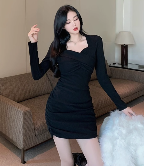 Summer new elegant temperament pleated waist design square neck short-sleeved little black skirt slit dress